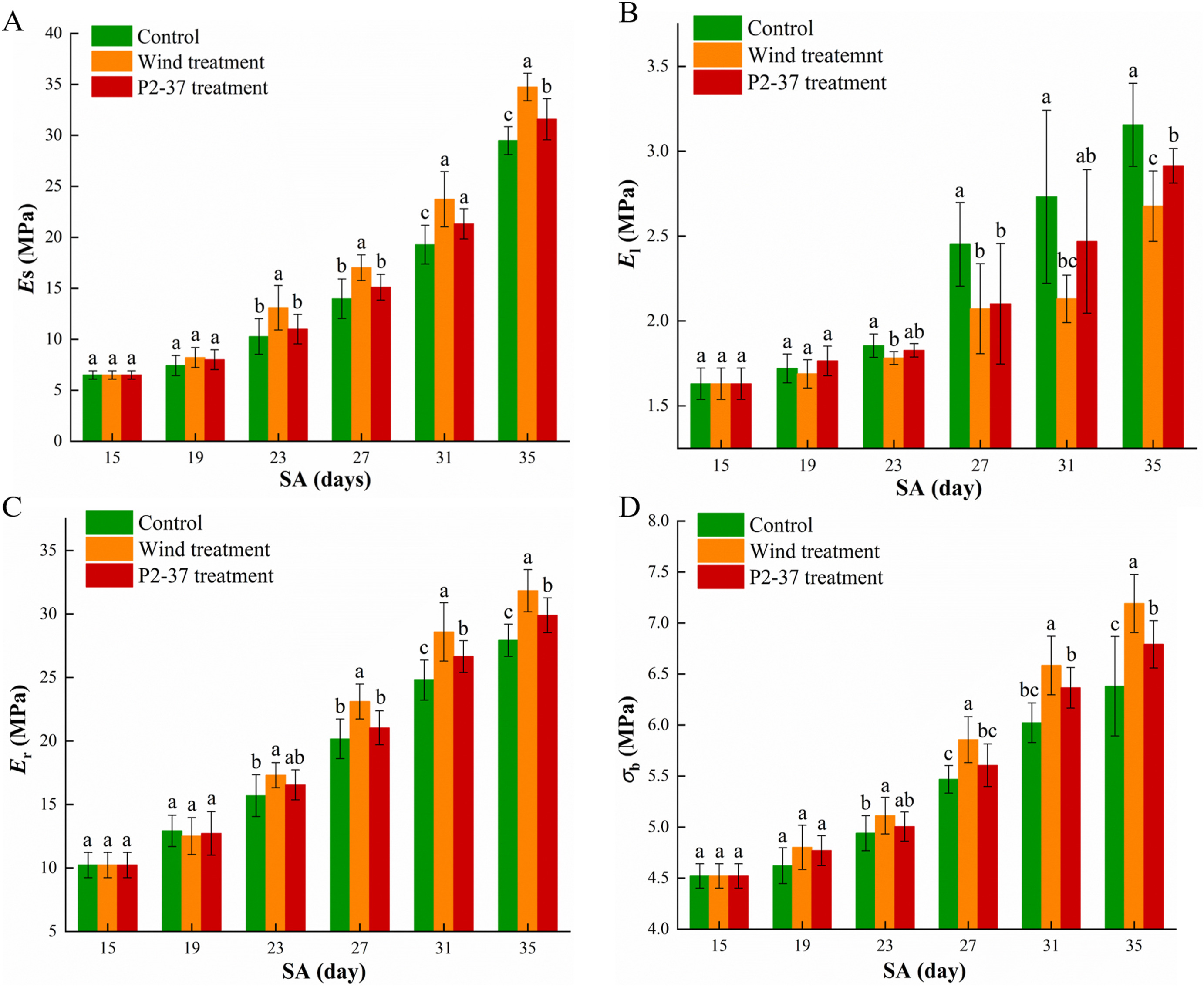 图 6. 不同处理对番茄幼苗机械特性的影响。(A)幼苗茎秆弹性模量(Es)的变化。(B)幼苗叶片弹性模量(El)的变化。(C)幼苗根系弹性模量(Er)的变化。(D)幼苗茎秆弯曲强度(σb)的变化。SA:风扰动开始时的幼苗龄。
