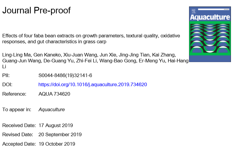 2019年10月16日,水产领域期刊《Aquaculture》(IF=3.022)在线发表了中国水产科学研究院珠江水产研究所研究团队题为“Effects of four faba bean extracts on growth parameters, textural quality, oxidative responses, and gut characteristics in grass carp”的研究论文。