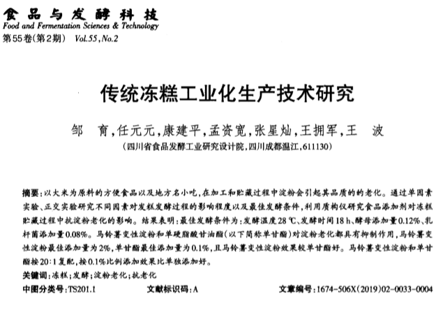 2019年,《食品与发酵科技》期刊在线发表了四川省食品发酵工业研究设计院题为“传统冻糕工业化生产技术研究”的文章,在文章中,研究人员使用上海腾拔Universal TA质构仪测定传统冻糕的硬度、弹性、回复性等指标。
