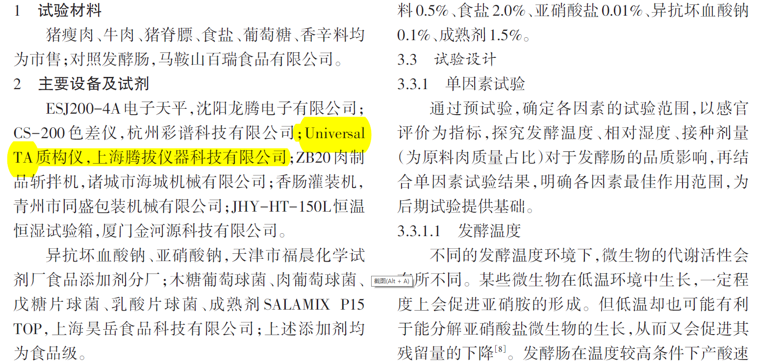2020年,四川省食品发酵工业研究设计院有限公司研究人员在国内期刊《食品与发酵科技》在线发表了题为“火锅用发酵肠工艺优化研究”的研究文章。在该论文中,研究人员使用上海腾拔仪器科技有限公司的Universal TA质构仪来测定发酵肠的硬度、弹性、粘性、咀嚼性和黏聚性
