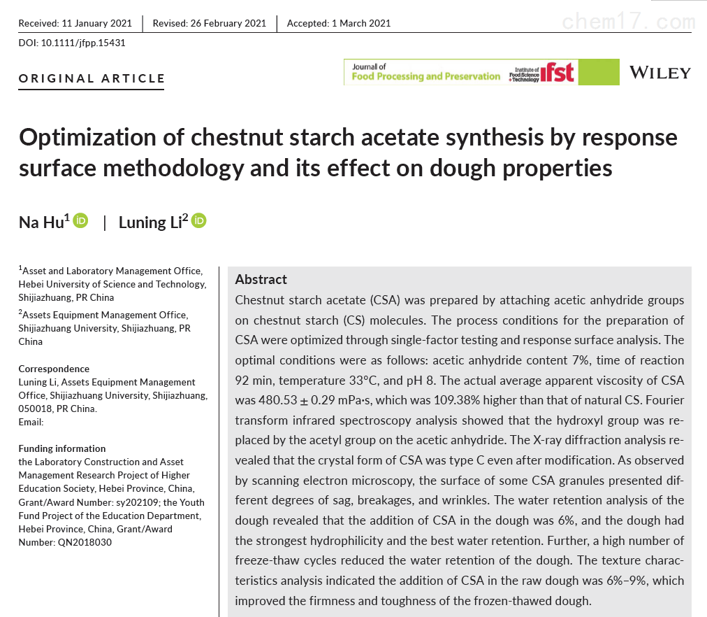 Technical articles2021年,河北科技大学和石家庄学院研究人员联合在国际食品期刊《Journal of Food Processing and Preservation》(IF=2.190)发表了题为"Optimization of chestnut starch acetate synthesis by response surface methodology and its effect on dough properties“的研究论文。在该论文中,研究人员利用上海腾拔Universal TA研究型质构仪测定了面团的硬度和韧性。