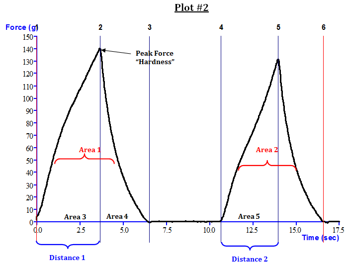咀嚼性仅适用于固体产品,计算公式是胶黏性*弹性(距离2/距离1)