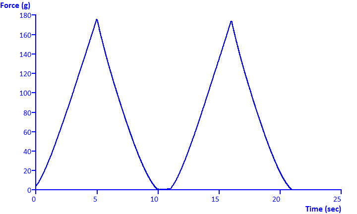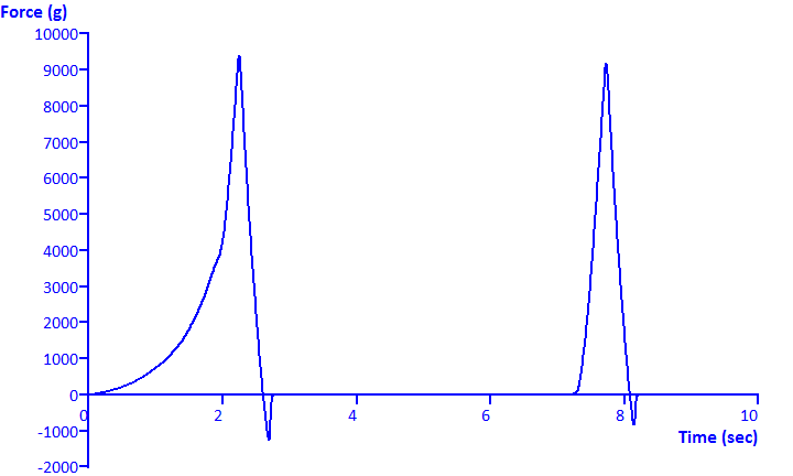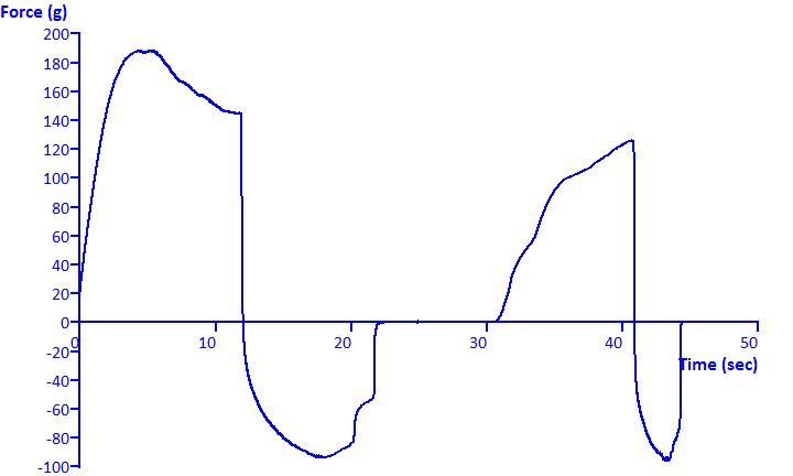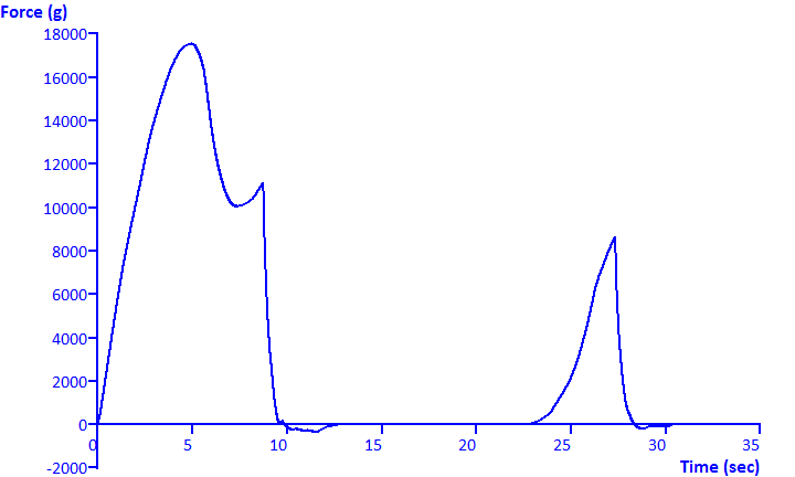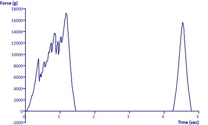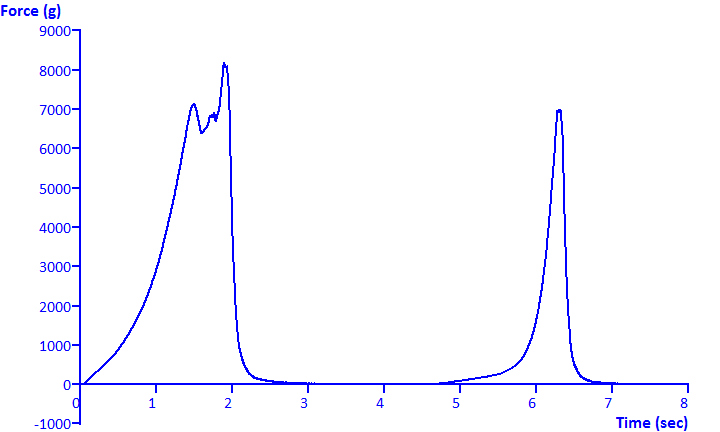 不是所有的产品都有脆性,但是在探头第1次压缩样品的过程中,当它们破裂时,在曲线有第1个峰的位置(在该处力值下降),出现脆性点。