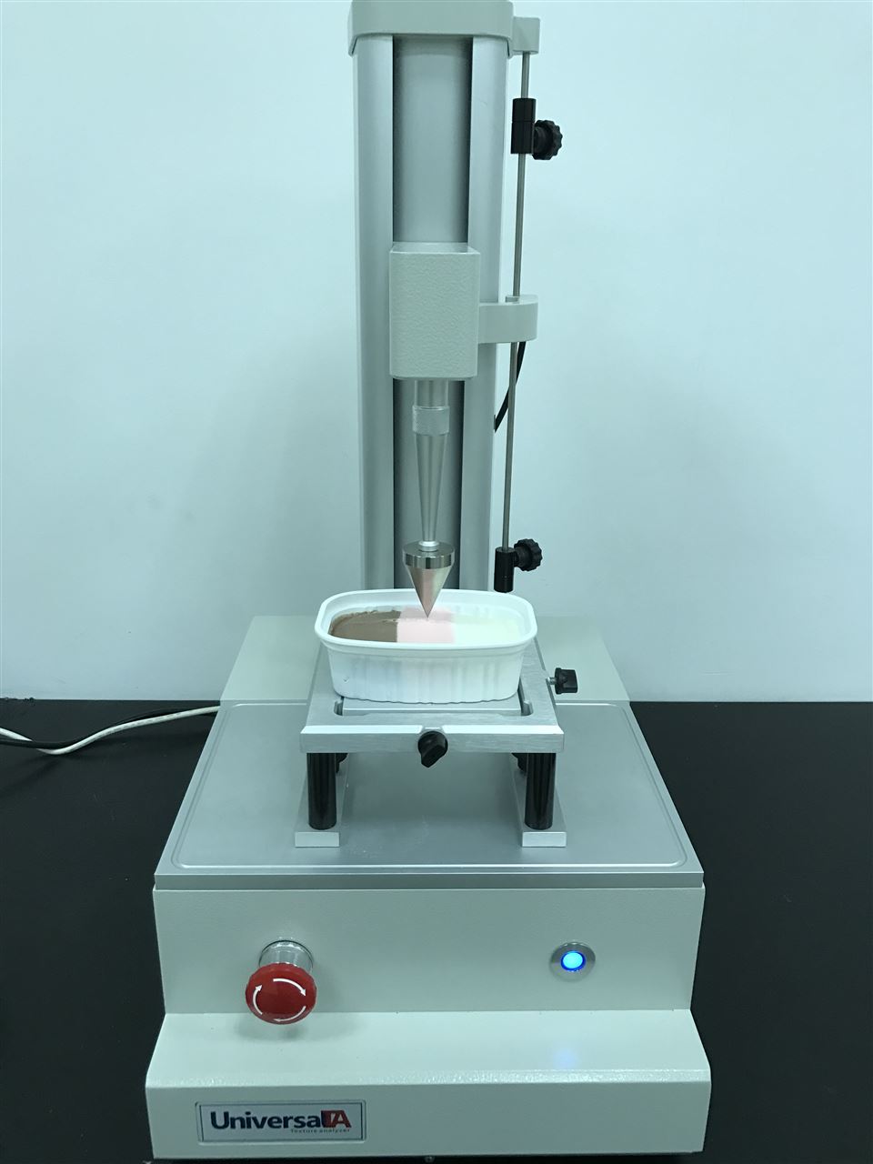将熟化后的人造奶油放于锥形探头的正下方进行柔软度测试。测试条件设置如下